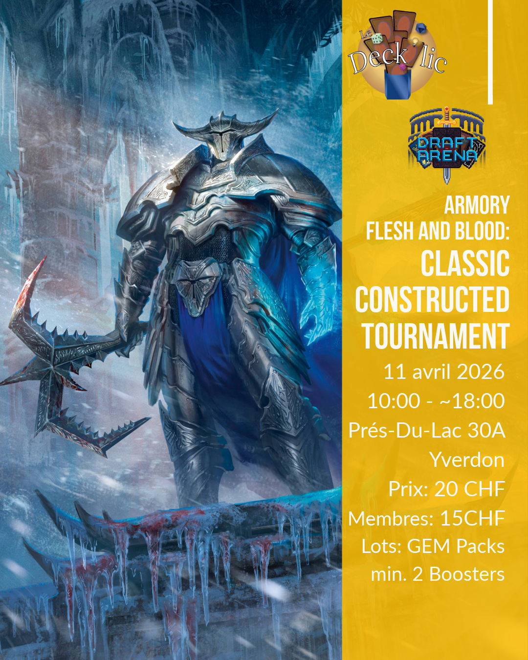 🩸 Armory Flesh and Blood – Classic Constructed 🩸 Prêt à entrer dans l’arène et prouver ta maîtrise ? Rejoins-nous pour un tournoi Classic Constructed au Deck’lic, en partenariat avec Draft Arena ! ⚔ 📅 11 avril 2026 🕙 10:00 – 18:00 (max) 📍 Le Deck’lic – Rue des Prés-du-Lac 30A, Yverdon-les-Bains 💰 Prix d’entrée […]